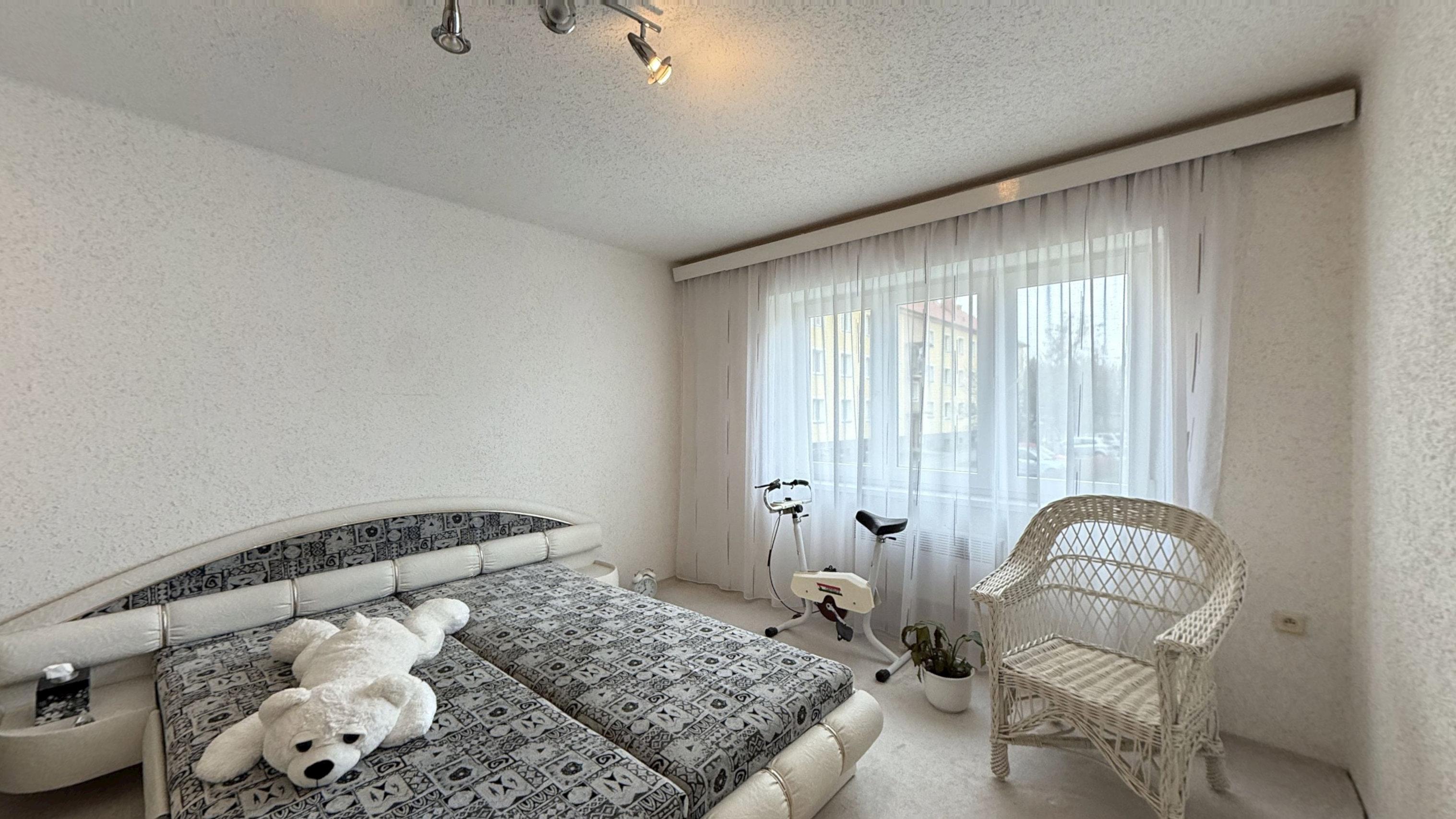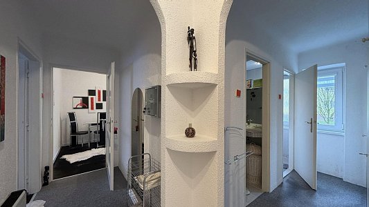 Stav bytu si nejlépe prohlédnete ve virtuální prohlídce (3D sken nemovitosti – Matterport), která je součástí inzerce. Po zaškrtnutí ikony červeného křesílka ve spodním menu virtuální prohlídky se Vám nemovitost zobrazí bez vybavení a zařízení, po zaškrtnutí ikony měřítka se Vám zobrazí rozměry bytu.