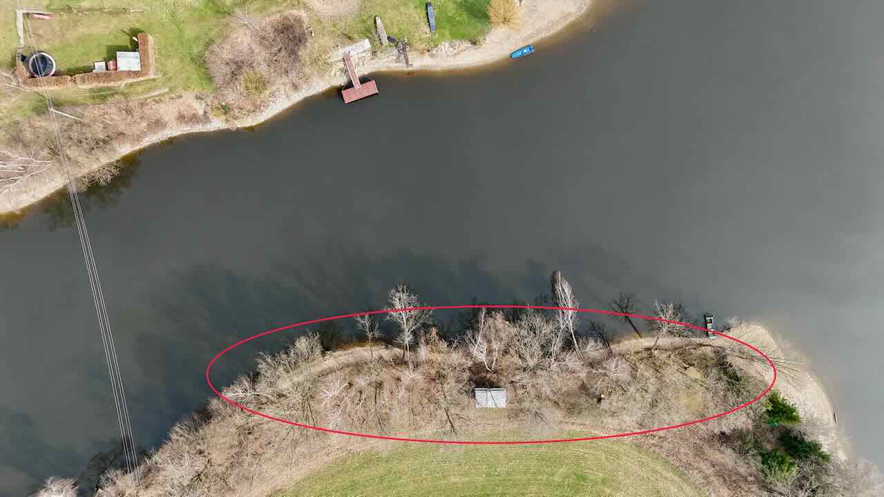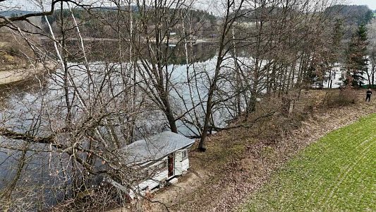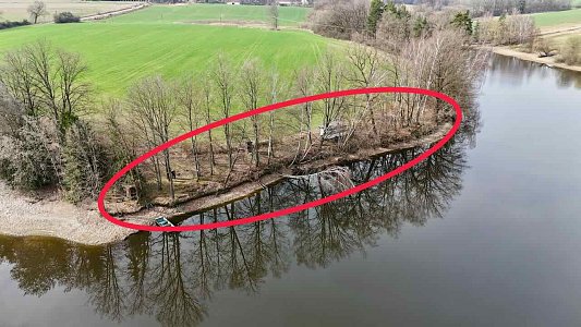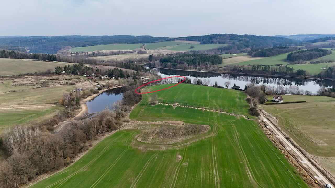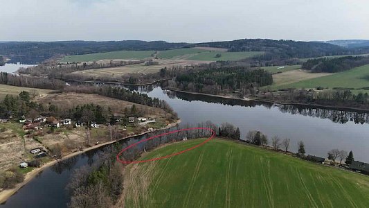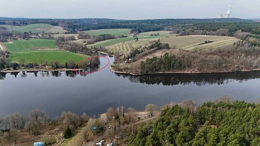 Pozemek se nachází v odlehlé části přehrady bez přímého příjezdu po pevnině. Přístup je řešen po vodě – z místa, kde lze zaparkovat vozidlo, je vzdálenost k pozemku přibližně 290 m.