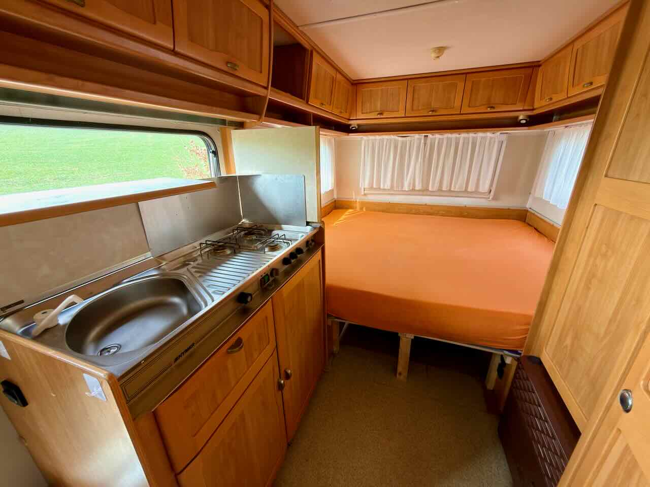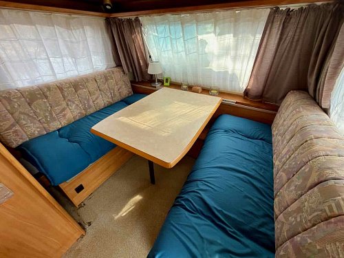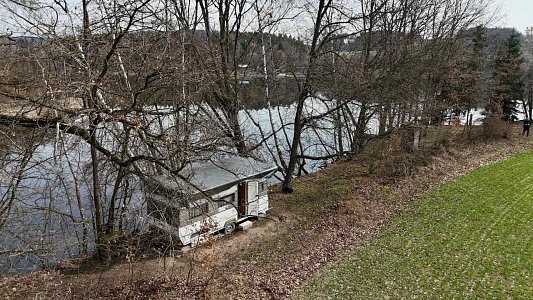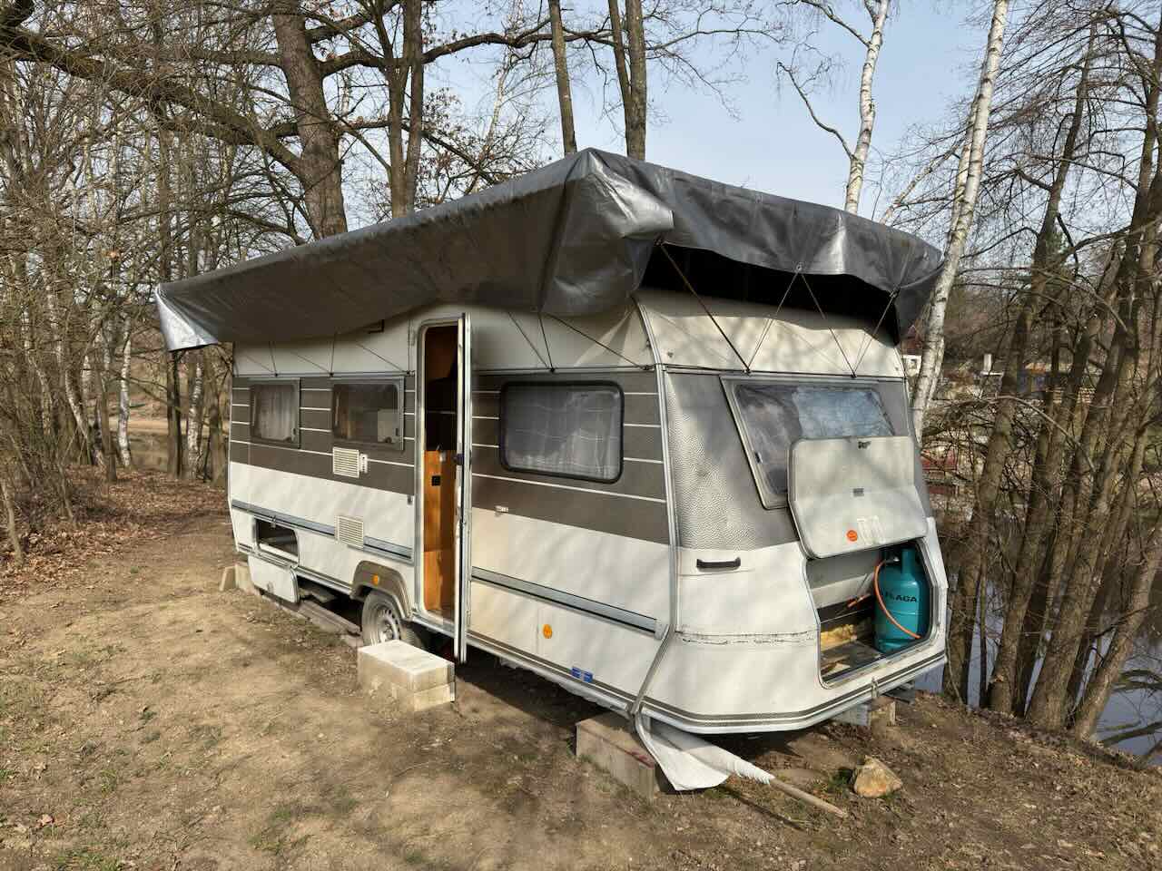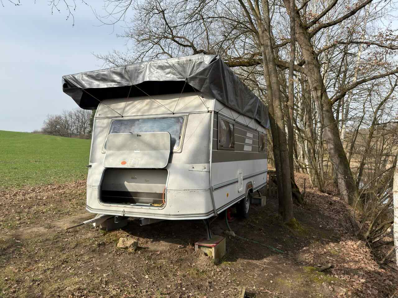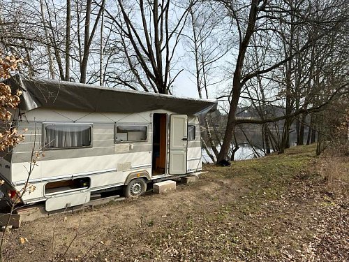 Na pozemku je umístěn karavan ve velmi dobrém technickém stavu: se spaním pro více osob, plynovým vařičem a topením, základním rozvodem užitkové vody a úložnými prostory.